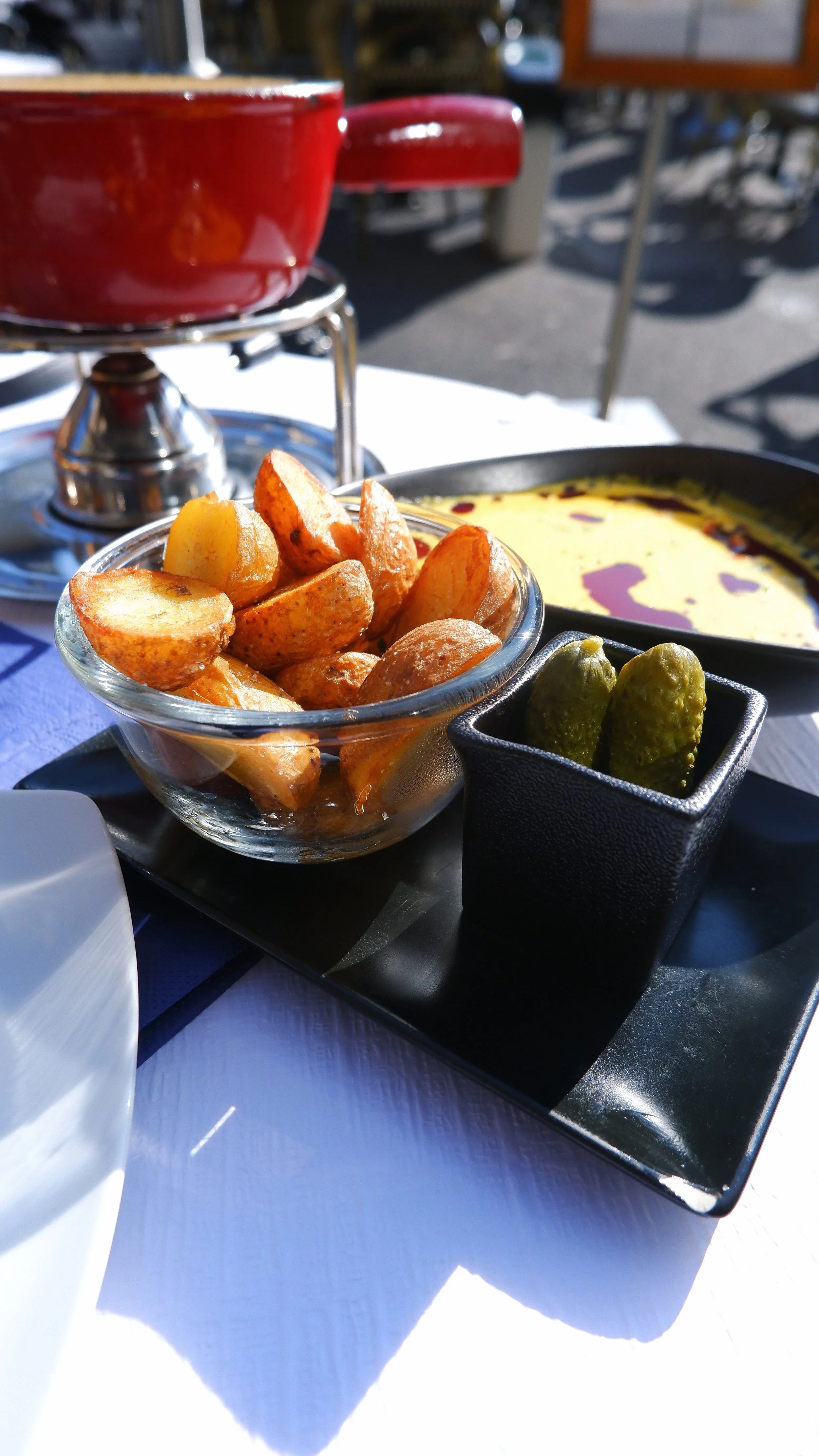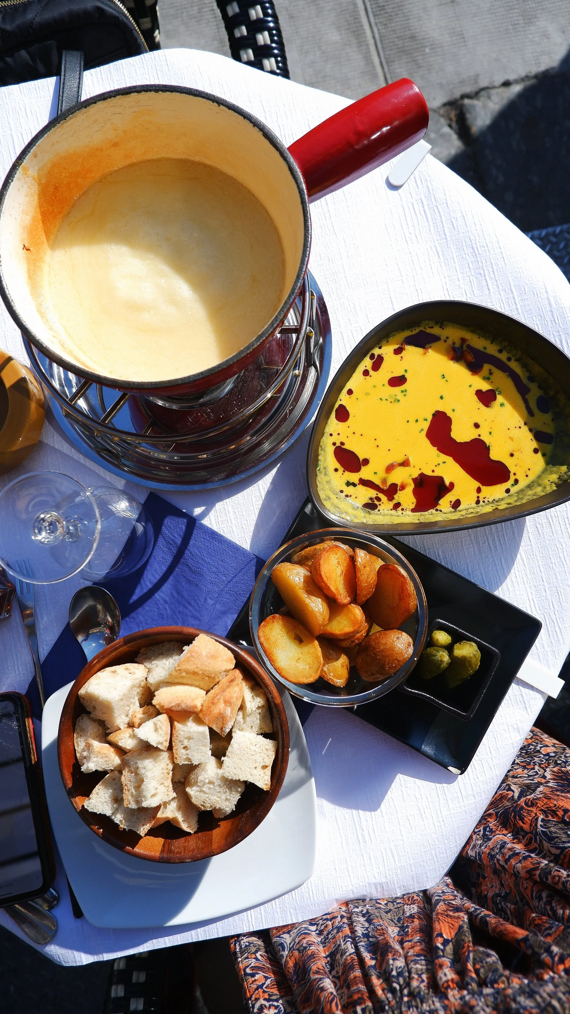 My dining drew eyeballs from the tables around me. It could've been the fact I had melting cheese all over or that I was eating from the fondue fork (a faux pas by all accounts). An older couple were charmed by my glee, pretended to join me as they passed. We giggled. At least out in the warm sun, my fingers could thaw and I could continue my walk.